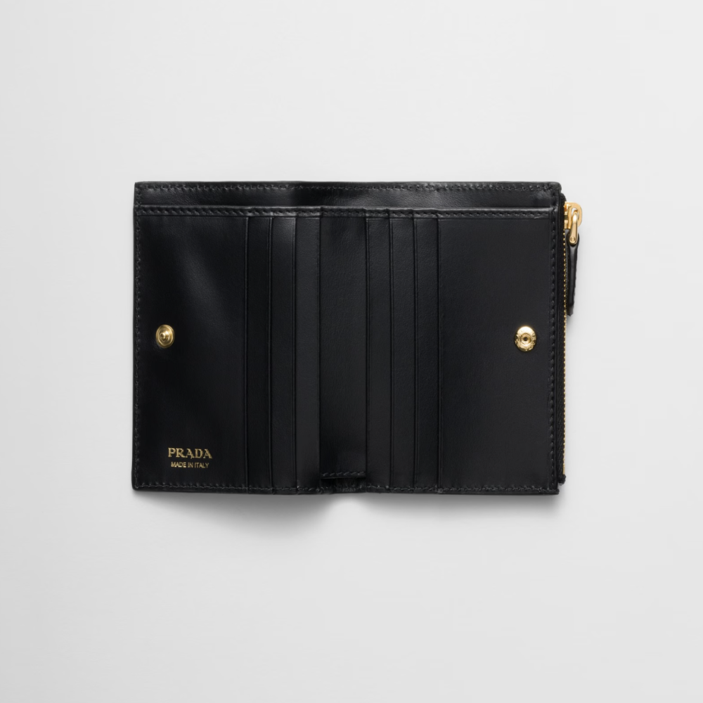 洗練されたシルエットのエレガントなレザー財布。アイコニックなプラダ シンボルのモチーフにインスパイアされたエンボス加工の幾何学模様を施したアイテム。 トライアングルのモチーフ スナップ開閉式 エナメルメタルのトライアングルロゴ 札入れ1個 カードホルダー6個 内ポケット2個 内側にファスナー付コインポケット 高さ: 8.5cm 幅: 11.5cm